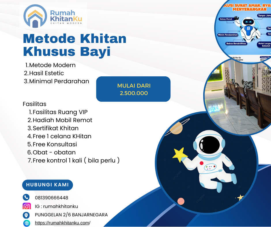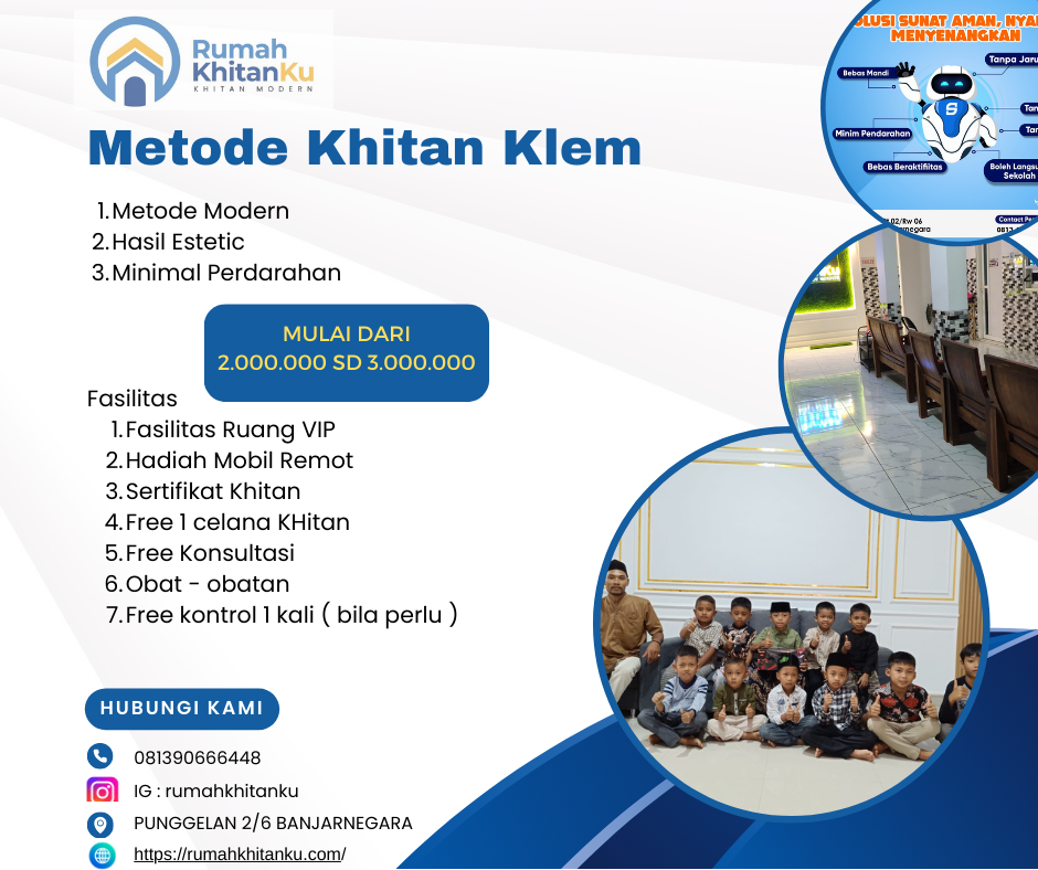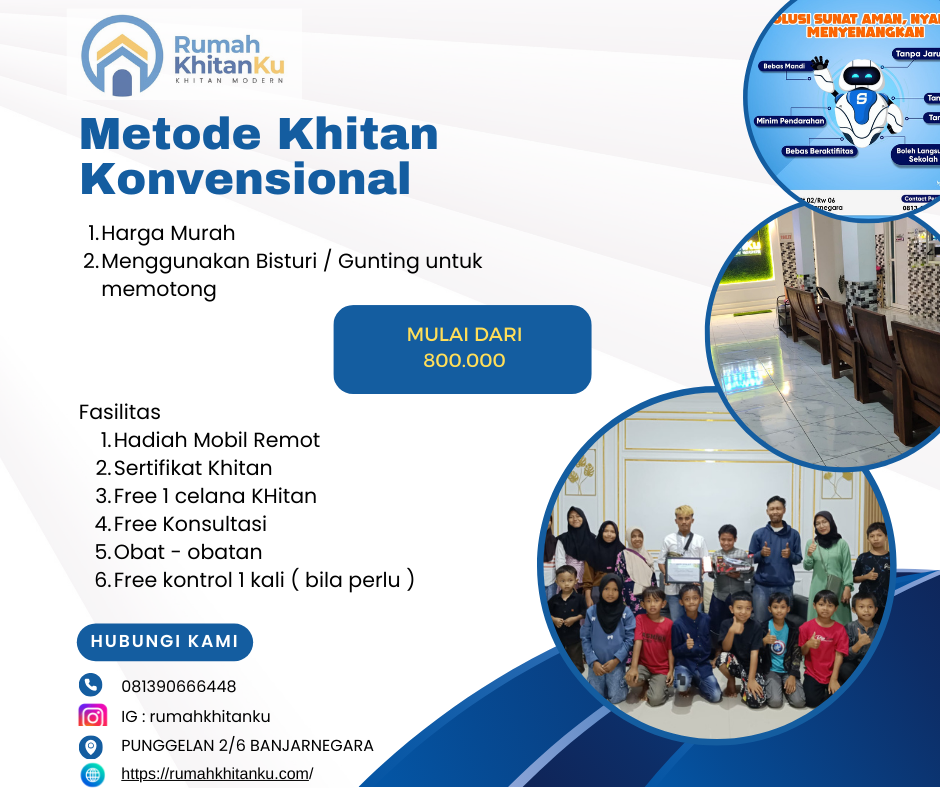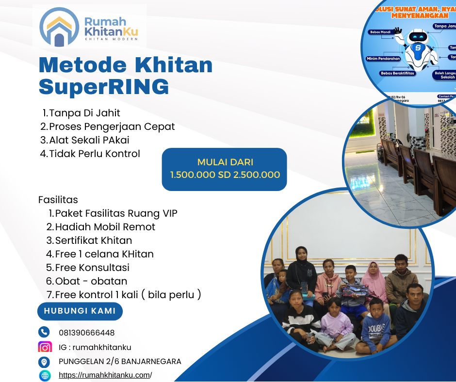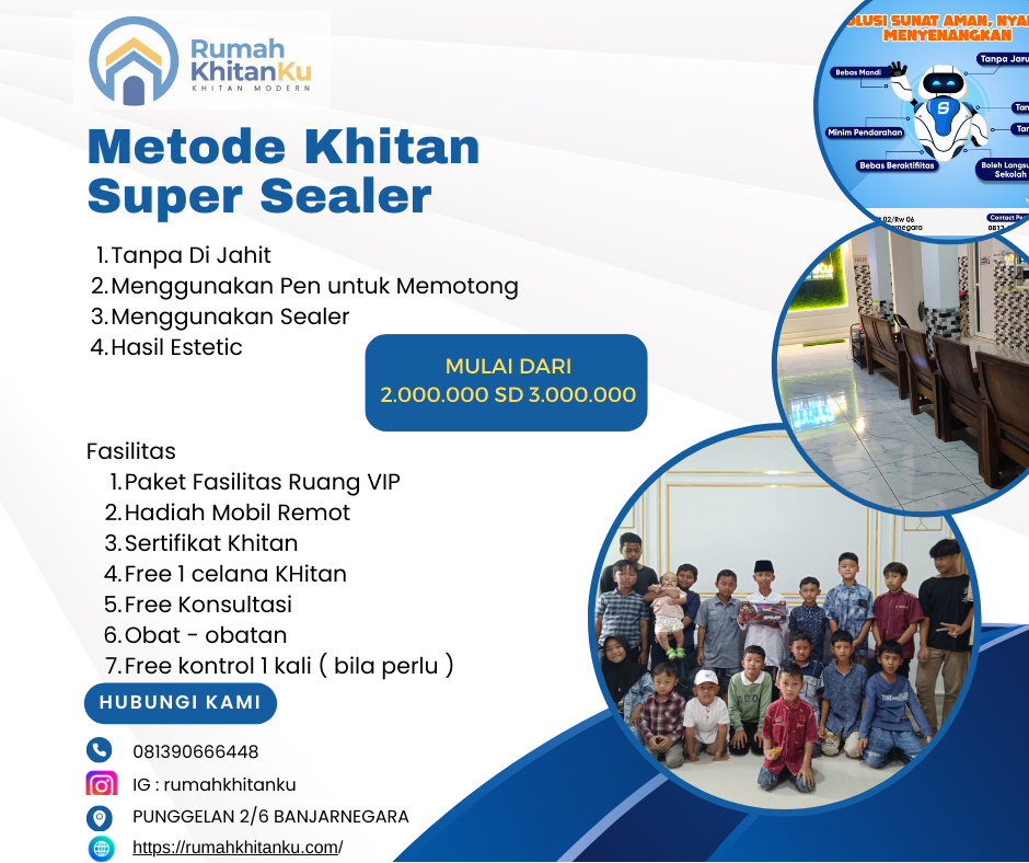 Memilih layanan khitan yang tepat menjadi keputusan penting bagi orangtua, metode khitan masa kini hadir sebagai solusi yang lebih aman, minim nyeri dan proses pemulihan lebih cepat. Rumah Khitan-Ku Banjarnegara memberikan pelayanan professional dengan praktisi yang tersertifikasi